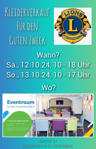 Ab sofort bis zum 4. Oktober 2024 sammeln die Damen des Lions-Club Meissen-Domstadt Kinder- und Damenkleidung, um sie zum verkaufsoffenen Wochenende eine Woche später für den guten Zweck zu verkaufen. Abgegeben werden können die sauberen und noch gut tragbaren Sachen rechtselbisch in der Moritzapotheke in der Zaschendorfer Str. 23 sowie linkselbisch im Autohaus, Wilsdruffer Str. 47.