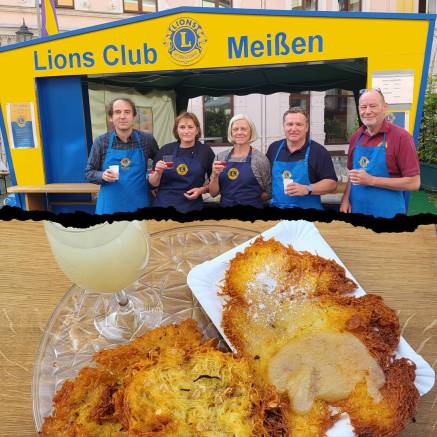 Die Herren des Lions Club Meissen verkaufen seit vielen Jahren zum Weinfest wohlschmeckende und nach einer Geheimrezeptur entstandene Klitscher (Kartoffelpuffer). Seit geraumer Zeit unterstützen wir sie dabei, denn es ist nicht nur mit viel Arbeit verbunden, sondern auch mit einer Menge an einsatzbereiten Freiwilligen. Und jedes Jahr auf's Neue macht es unheimlich viel Spaß, gemiensam Gutes zu tun!